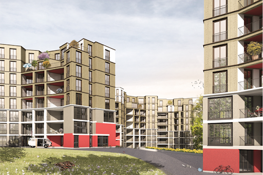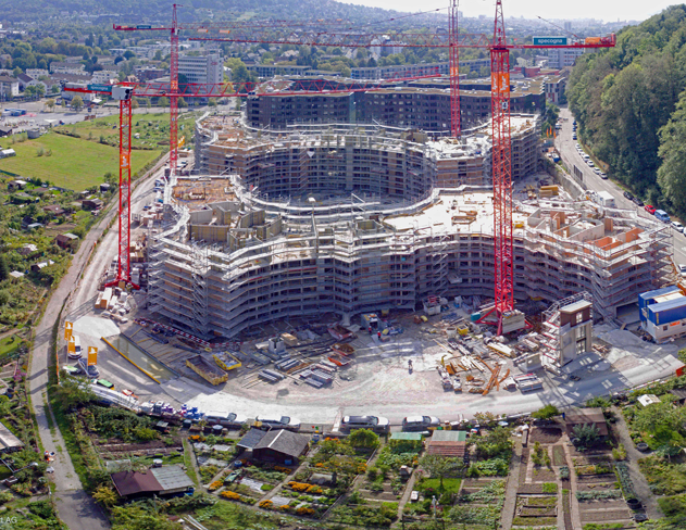 Neubau von zwei um einen Hof angeordneten Gebäudekomplexen mit 251 Mietwohnungen, einem Atelier und einem Gemeinschaftsraum. Im Hof als einzelnes Gebäude entstand ein Kindergarten. Unter der ganzen Überbauung wurde eine Tiefgarage erstellt.